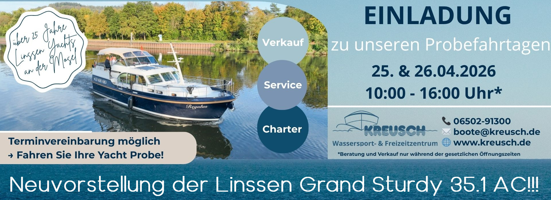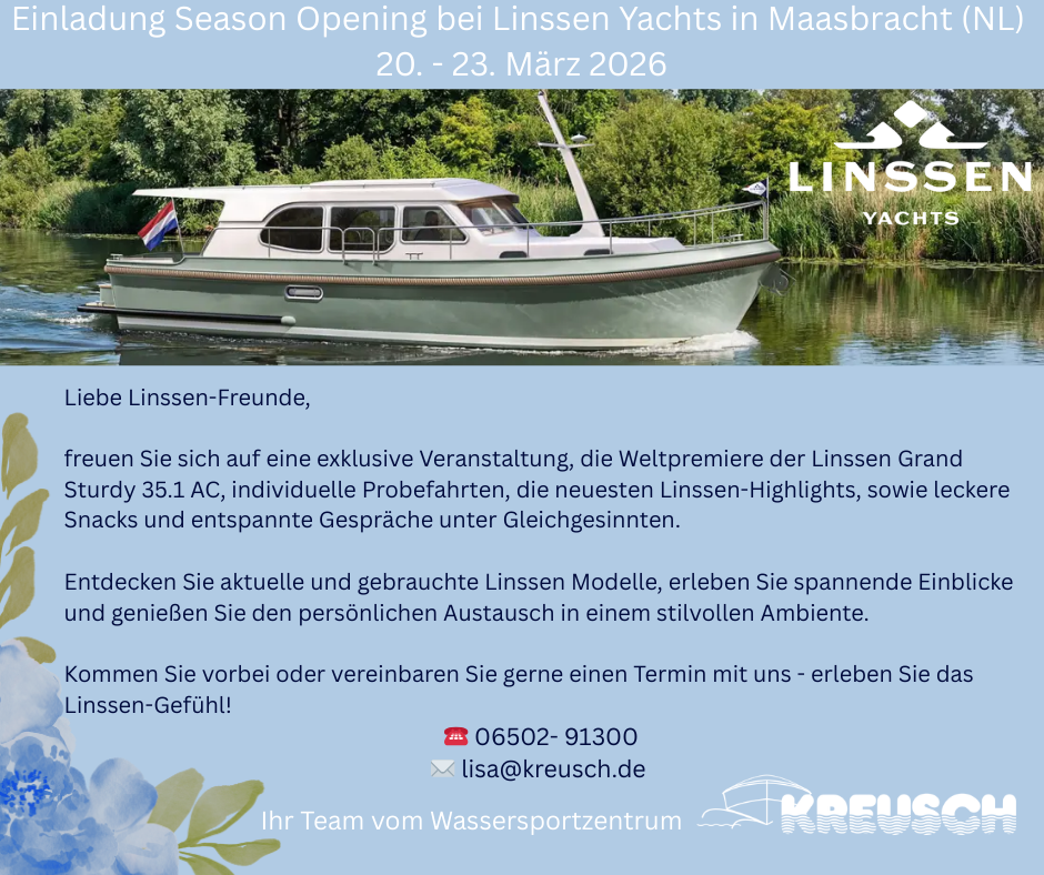 Es erfüllt uns mit Stolz, seit 1998 offizieller Vertreter von Linssen Yachts zu sein. Als Ihr Ansprechpartner für Linssen Yachten im süd- & westdeutschen Raum sowie in Luxemburg freuen wir uns, Ihnen unser umfangreiches Angebot vorzustellen. Ebenso lange vertreten wir die Marke Quicksilver im Sportboot Segment von 4,50 m bis 10 m. Lassen Sie sich von unserer Expertise und unserer Leidenschaft für den Wassersport inspirieren!